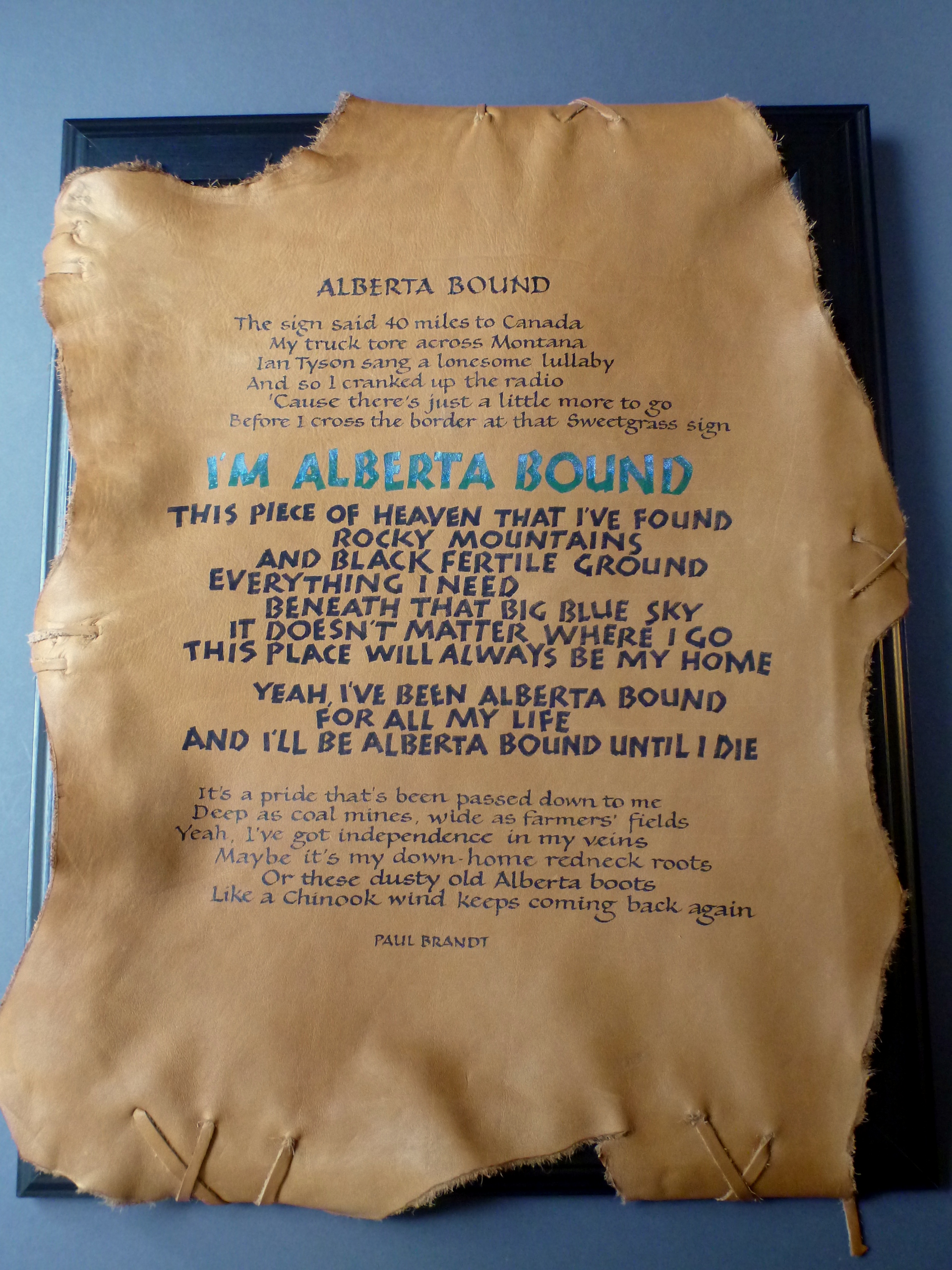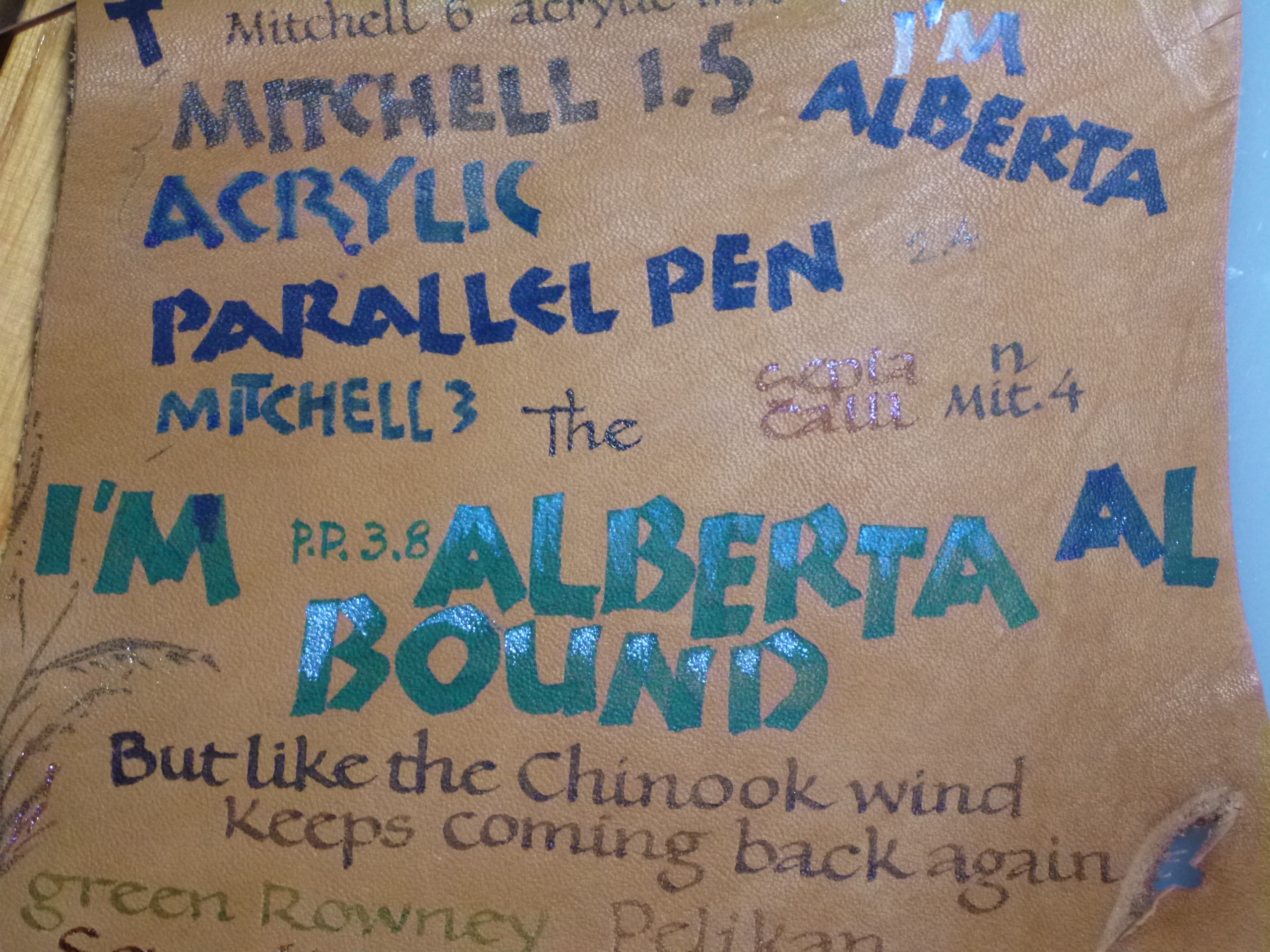 Above on the left is the test piece of leather and at right the final product for Paul Brandt’s lyrics to “Alberta Bound” which I lettered for display (with Paul’s permission) at the 2013 Calgary Exhibition and Stampede’s Creative Showcase. The lettering styles are a combination of Neuland (the green and blue letters) and Bookhand (brown letters).