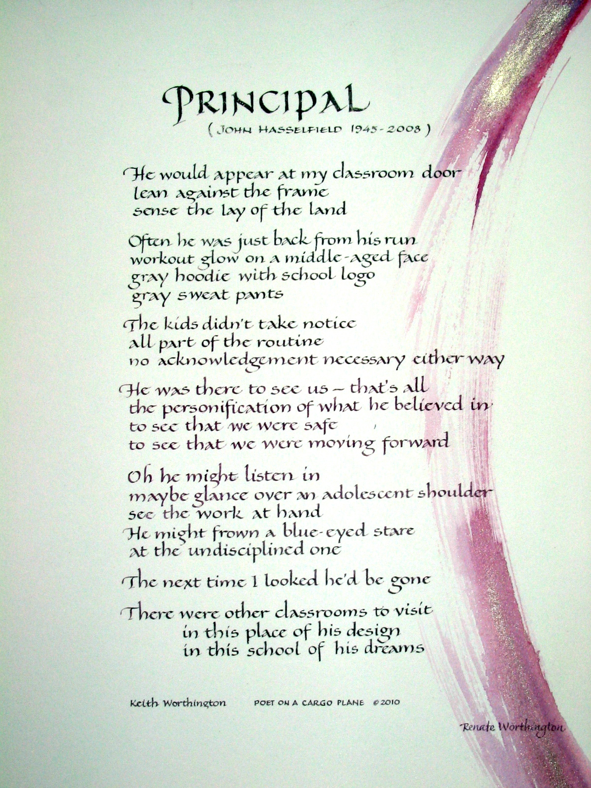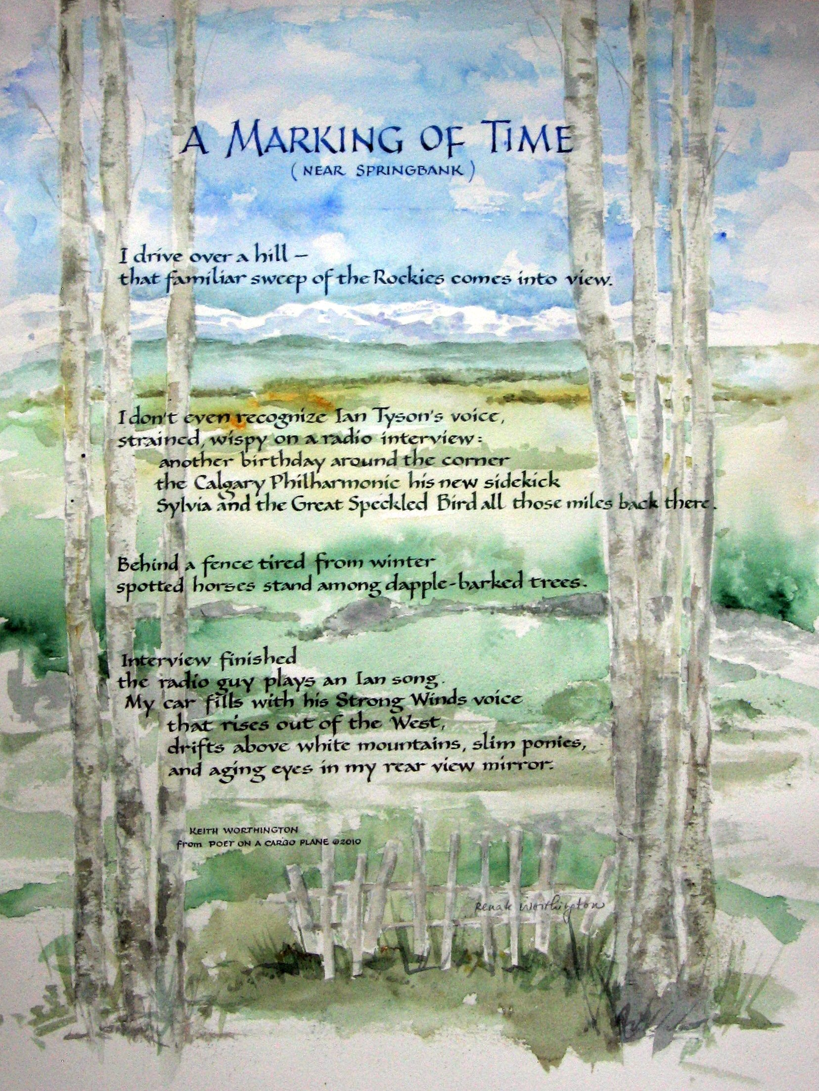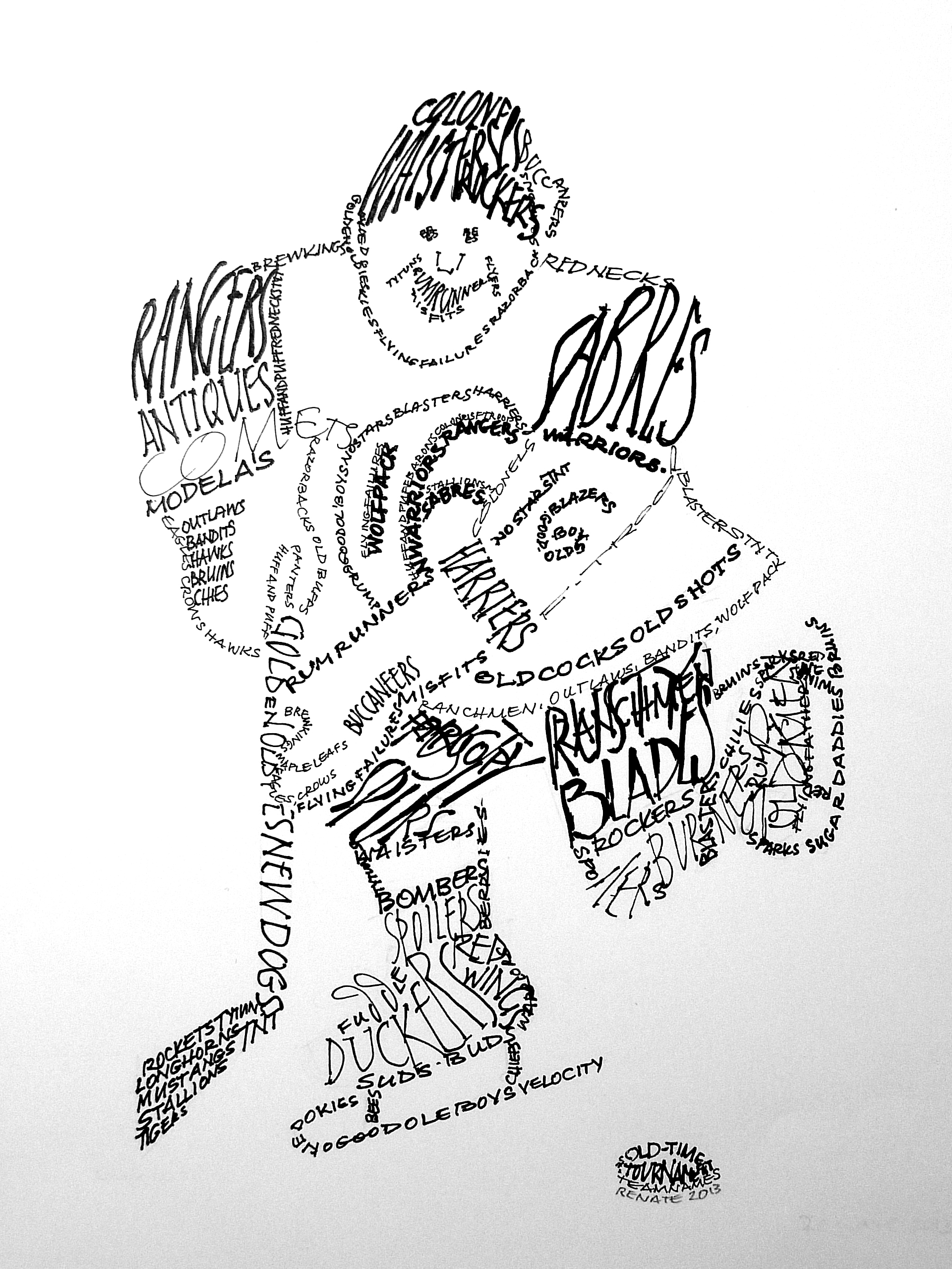 These few lines are part of the poem “Old-Timers Tournament” from Keith’s poetry book, After The Flood: Hockey Poems. Renate’s artwork is called a “calligram” and features the names of many old-timer hockey teams. The original size of the hockey player is 4 by 6 inches, and was drawn using several sizes of fine-tipped markers. Season’s greetings to all!