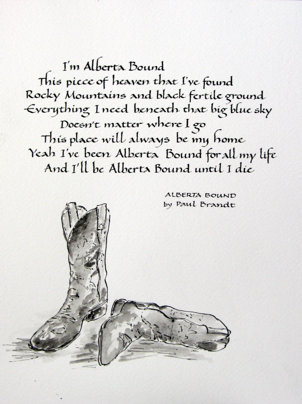 ALBERTA BOUND -excerpt from lyrics by Paul Brandt,  lettering and boots by Renate. Another version of Alberta Bound is written in “Neuland” below.