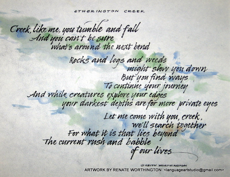 Puffs of Breath was first published in 2007. It features Keith’s poetry and many colorful pages of Renate’s calligraphy and artwork. The poems are presented in five sections: Breathing Outdoors, Breathing Together, Breathing in School, Breathing in the Dark, and Just Breathing. This book is “sold out” and is currently out of print.